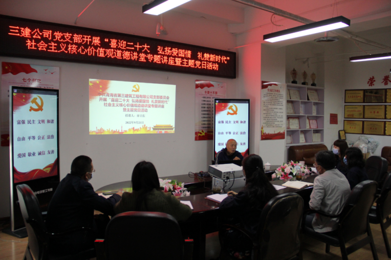 (省三建公司 訊 韓毓、王文杰/文 韓毓/攝 )2022年是黨的二十大召開(kāi)之年,是落實(shí)省第十四次黨代會(huì)精神開(kāi)局之年。為持續(xù)鞏固拓展黨史學(xué)習(xí)教育成果,加強(qiáng)精神文明建設(shè),深化民族團(tuán)結(jié)進(jìn)步宣傳教育和感恩教育,講好各族民族守望相助、團(tuán)結(jié)奮進(jìn)的國(guó)企故事,積極培育和踐行社會(huì)主義核心價(jià)值觀,9月21日,公司黨支部開(kāi)展“喜迎二十大 弘揚(yáng)愛(ài)國(guó)情 禮贊新時(shí)代”社會(huì)主義核心價(jià)值觀道德講堂專題講座暨主題黨日活動(dòng)。